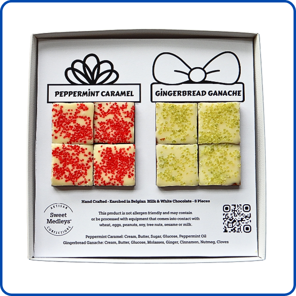 Share the Christmas gift giving season with a delicious hand-crafted assortment of classic chocolate flavors for the holiday - The Peppermint Caramel is handmade with chewy caramel infused with all natural fragrant peppermint oil - The Gingerbread Ganache is a mouthwatering gooey experience with all the comforts of cinnamon, cloves, ginger, molasses and nutmeg. Both confections are enrobed in Belgian milk and white chocolate with no artificial flavors, no artificial colors and no artificial preservatives.
