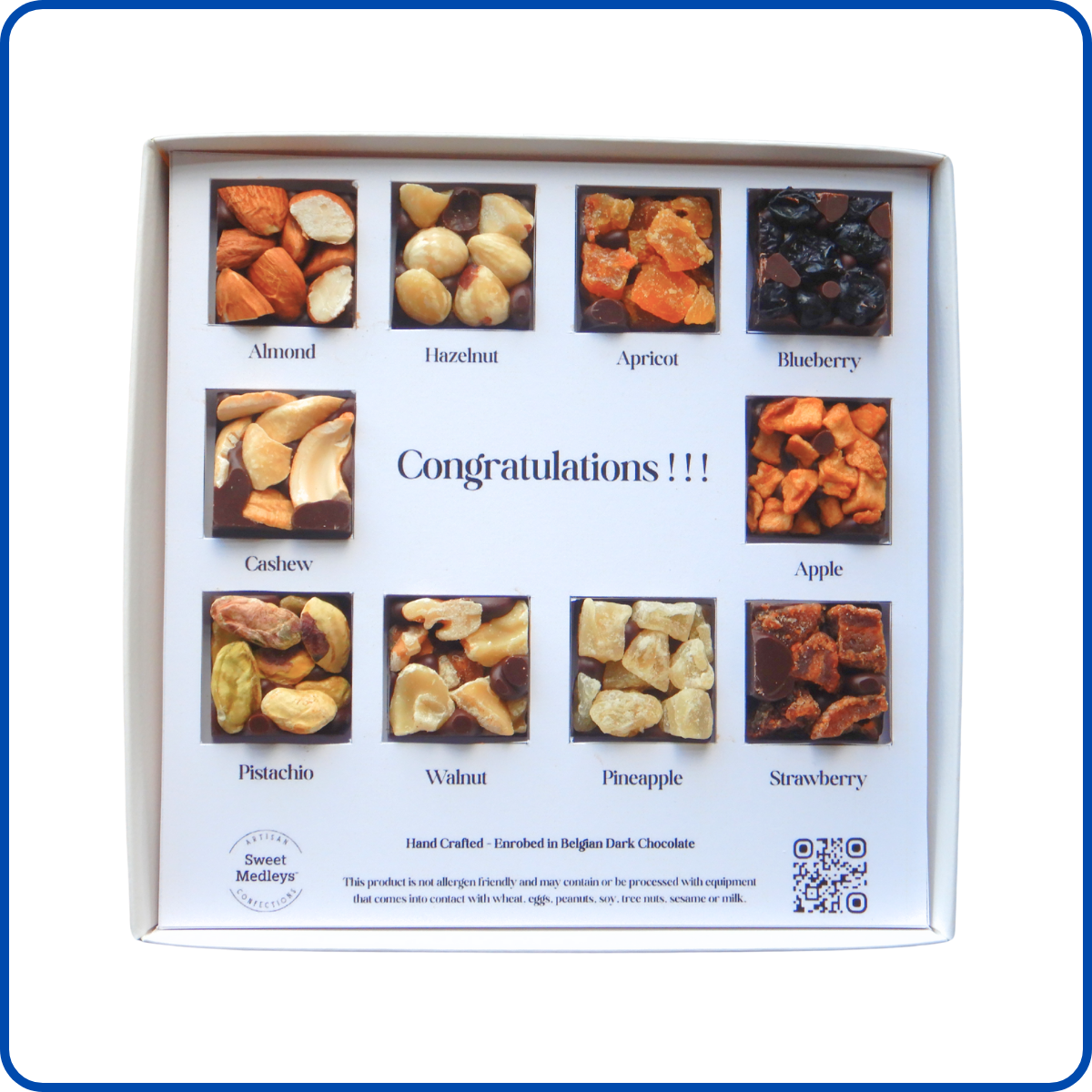 Fruits & Nuts includes: Almond, Apple, Apricot, Blueberry, Cashew, Hazelnut, Pineapple, Pistachio, Strawberry, Walnut - All enrobed in premium Belgian dark chocolate - 10 pieces.