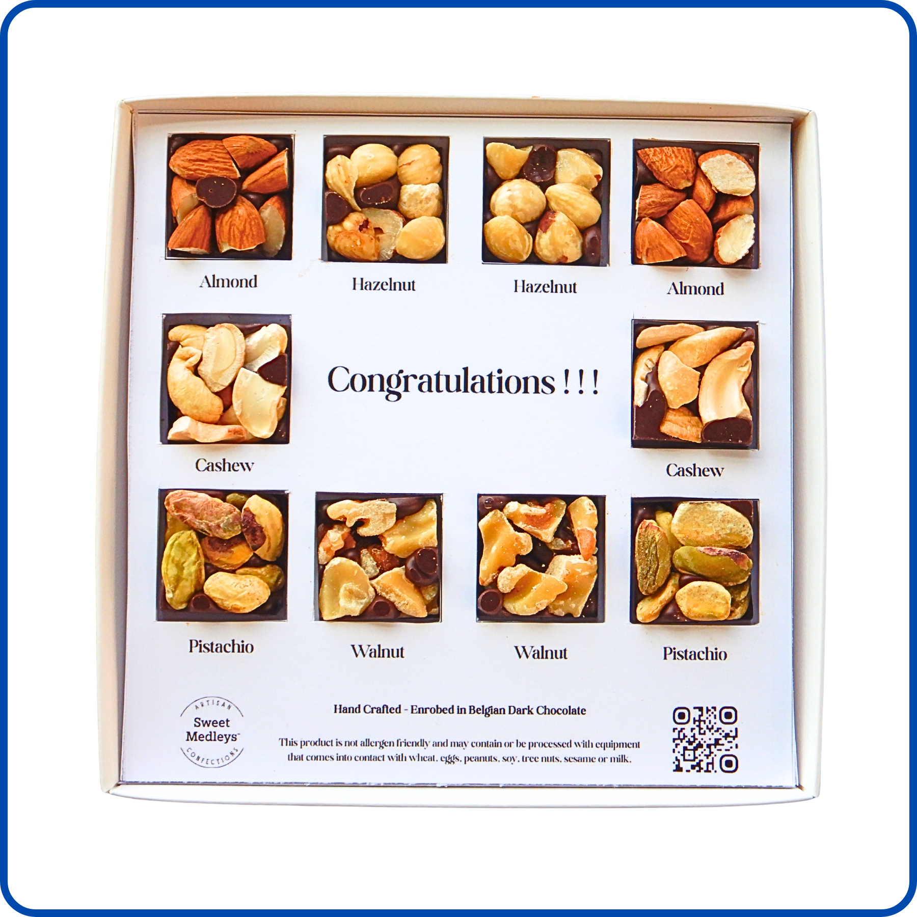 Nuts includes: Almond, Cashew, Hazelnut, Pistachio, Walnut - All enrobed in premium Belgian dark chocolate - 10 pieces.