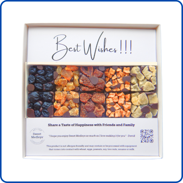 Fruits include: Apple, Apricot, Blueberry, Pineapple, Strawberry - All enrobed in premium Belgian dark chocolate - 10 pieces.